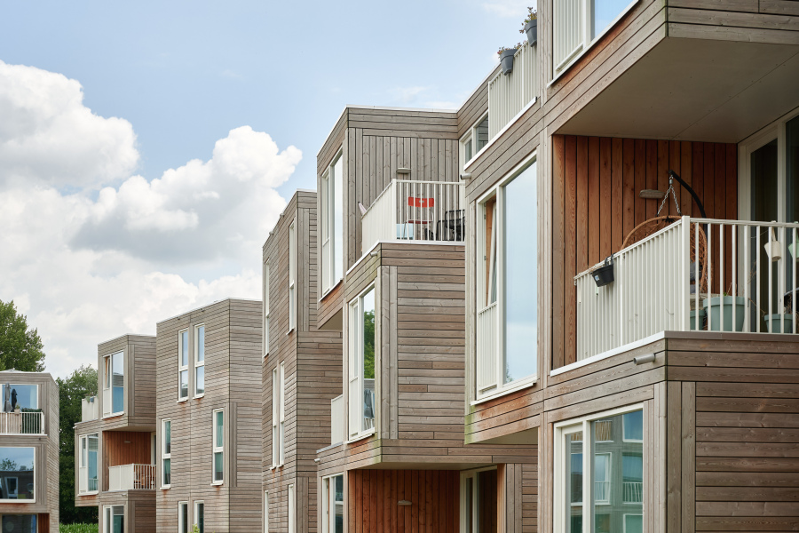 The first temporary homes in Brainport Smart District were designed by vector-i in collaboration with mHome and Felixx. Fifty-two modular apartments have been built in the district. The stacked homes are surrounded by ample space for shared greenery and a bioswale. The modules are owned by mHome and will remain in the area for 15 years. The homes are carefully integrated into the landscape, creating a high-quality appearance combined with a beautiful shared garden.